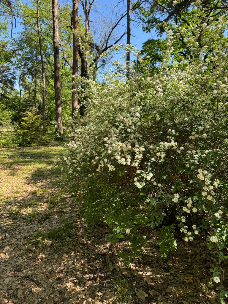 According to PictureThis, the bush is Bridalwreath Spirea, native to Korea, China and Japan. It’s supposed to flower on the oddly specific date May 5th but flowered early because it’s in Sofia.