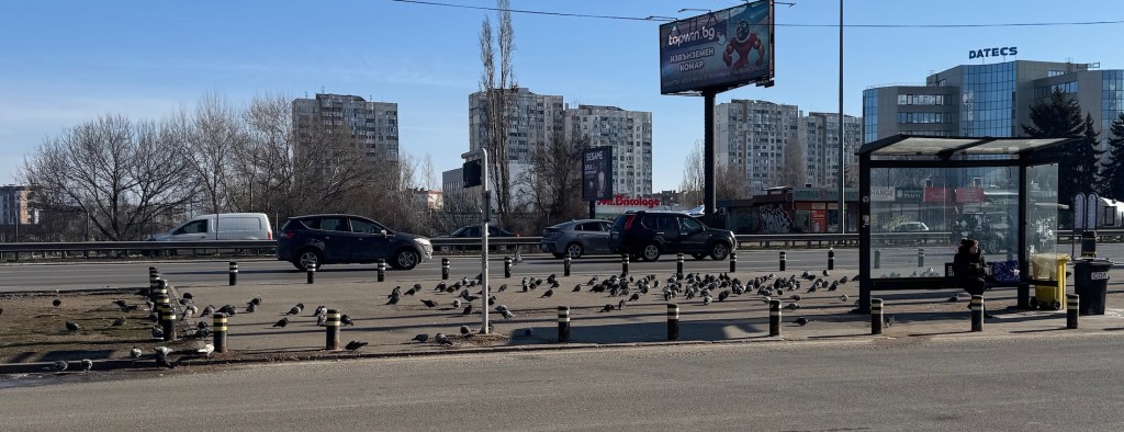 This pigeon gathering puzzled me. I didn’t see food or anything nearby, only cars. Why did they go and stay there, most of them not visibly moving? The big bucket to the right says salt.