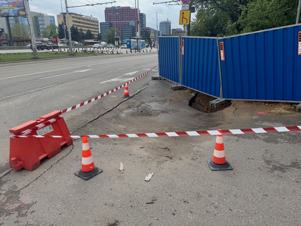 A hole opened on the road in my neighborhood as a result of the underground subway construction. The road is severely damaged, and it looks like the buildings nearby may start cracking as well. There were some attempts to fill the hole, but more holes opened. The sidewalk separated from the road, and there are large cracks over a long distance.