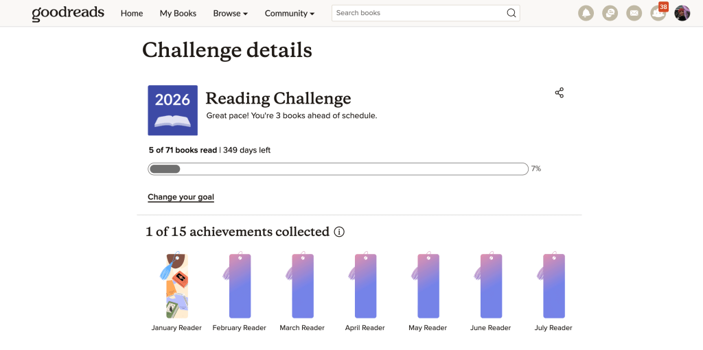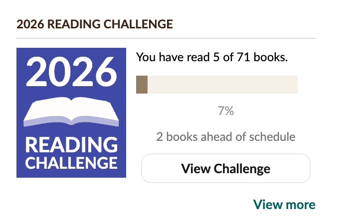 Goodreads, despite being less buggy with the Reading Challenge this year, doesn’t have a good estimation for how ahead of schedule I am. Their two screens argue that I’m either 2 or 3 books ahead. The mobile app also thinks it’s 3.