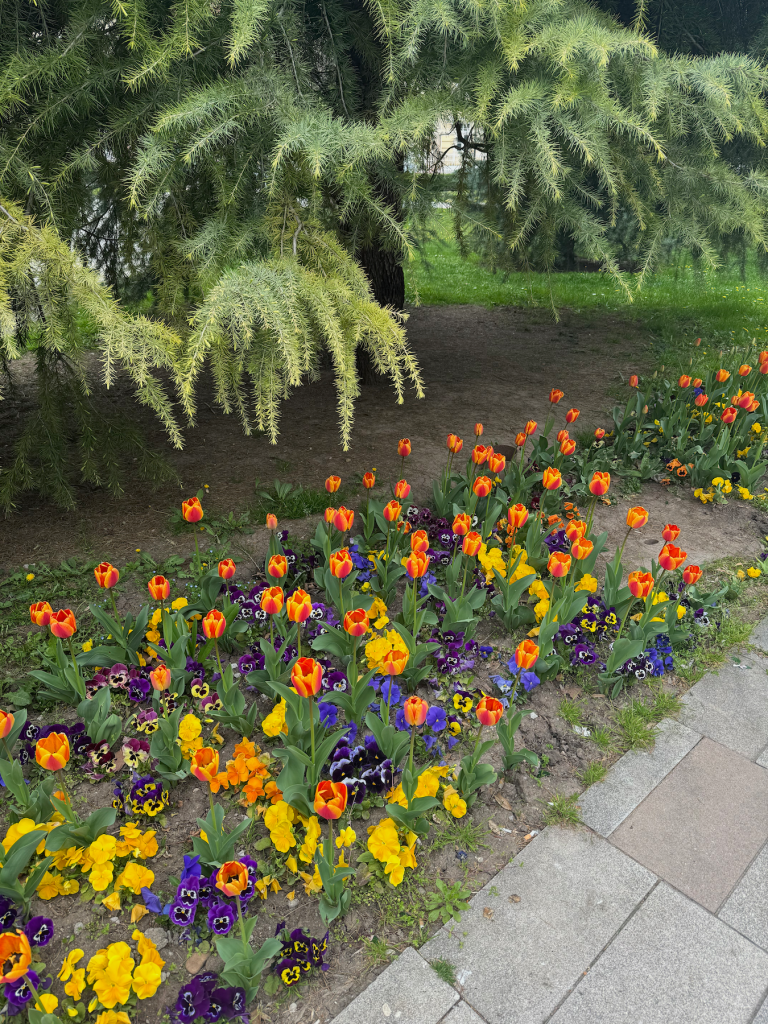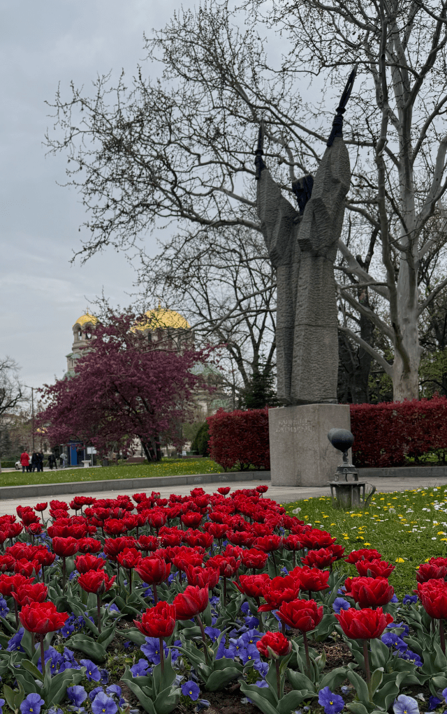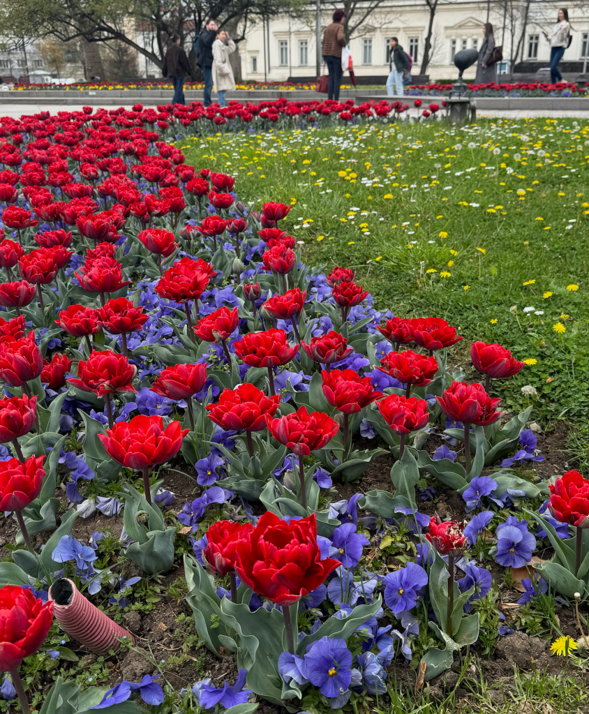 Here’s some tulips for you. Left to right are Tulips with the statue of St. Kliment Ohridski, the likely author of the Cyrillic alphabet. Then tulips with the parliament, and then tulips with violets. Sofia can sometimes be pretty.
