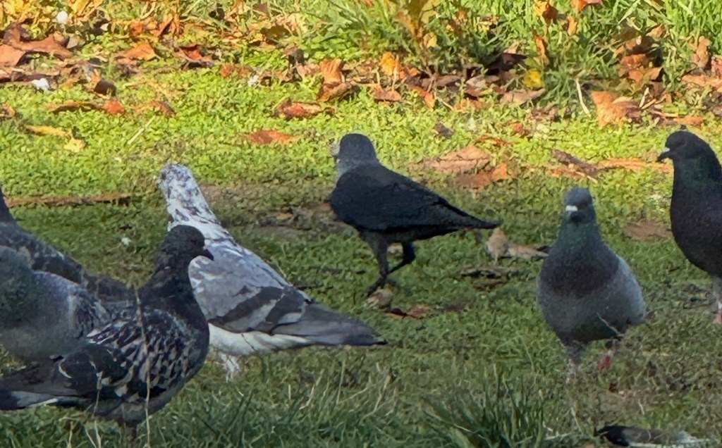 Here’s a photo of creatures that are smarter than city drivers. They don’t drive in the city, don’t form traffic jams, and don’t engage in road rage. The darker pigeon in the middle is a a tiny Jackdaw.