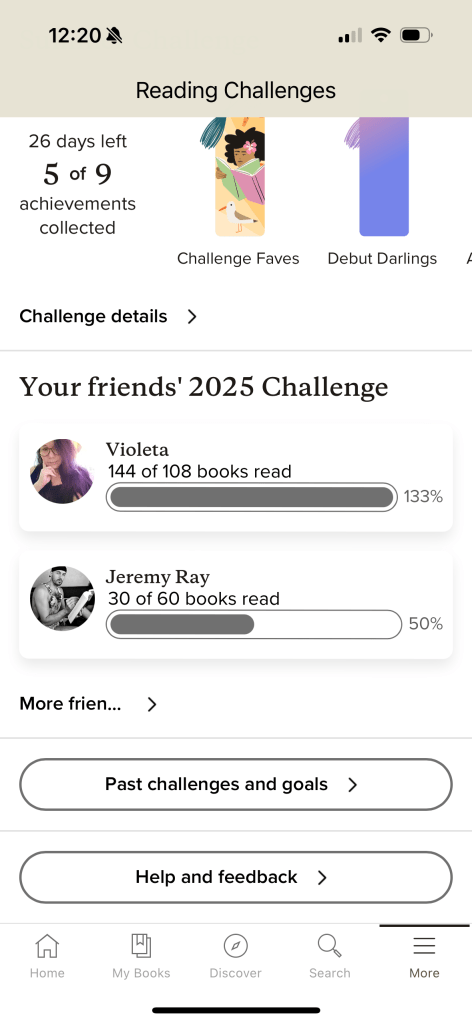 Last year, Amazon decided to clutter Goodreads with about a hundred new challenges while somehow hiding the only one that mattered to me. For a while, seeing friends’ challenge simply disappeared.