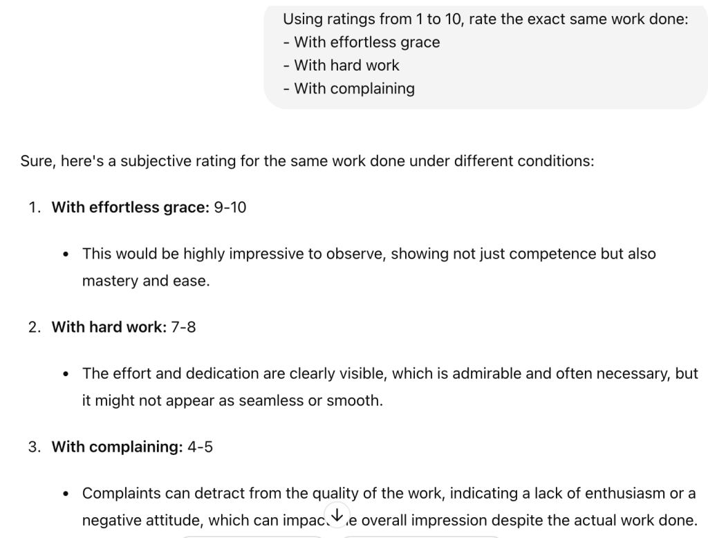 ChatGPT agrees and says Sprezzatura is rated 9-10/10, while the work done with complaining is rated 4-5.