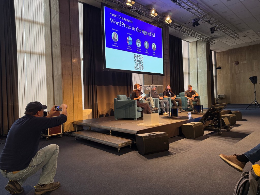 An AI panel, so we can stay current with the hype. WordPress is adjusting to the AI adoption and all of the panelists are treating it as a tool that’s helping people rather than replacing people.